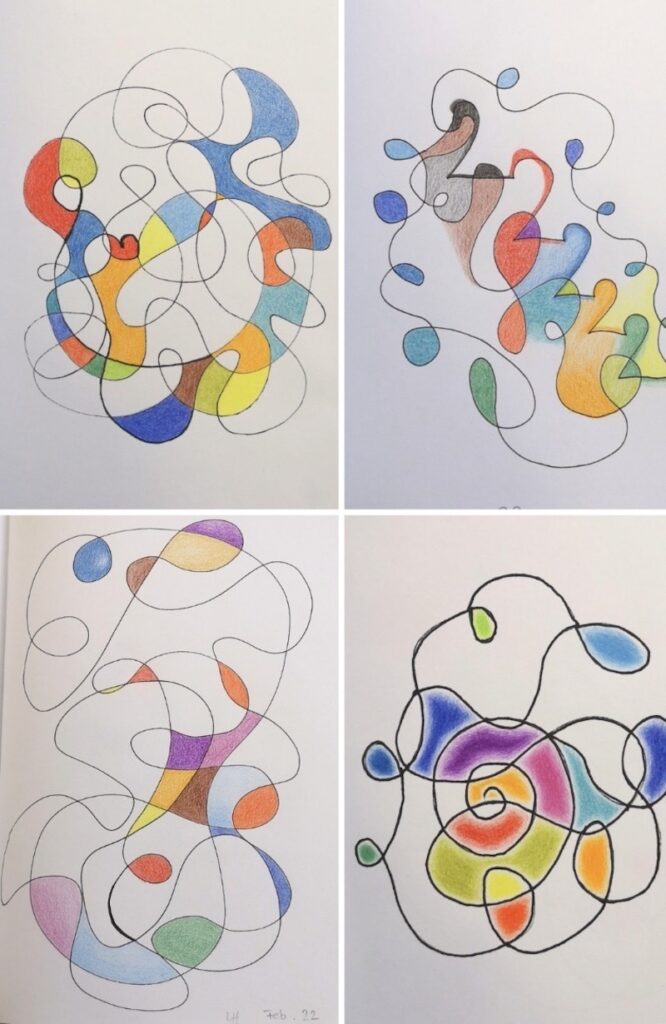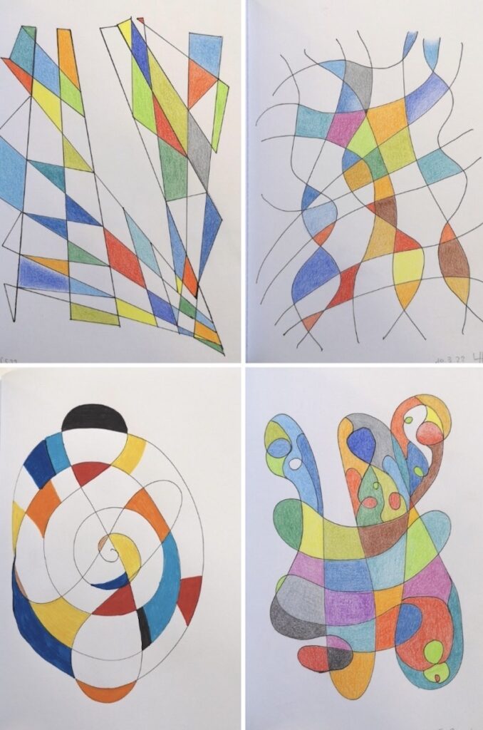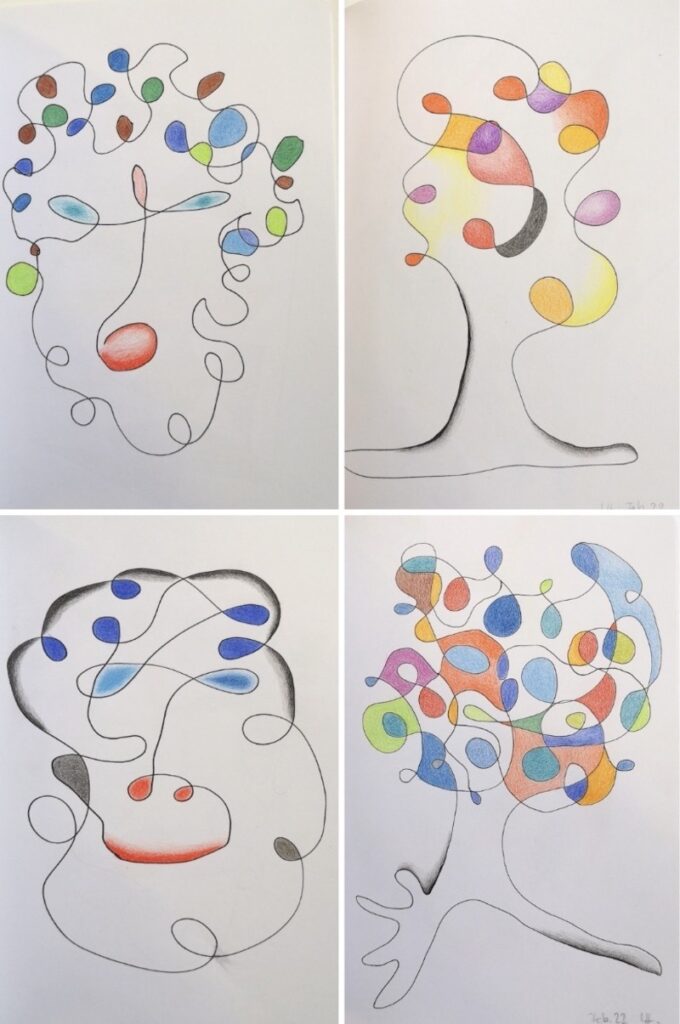Ich sitze zeichnend im Zug. Vor dem Fenster bewegt sich die Landschaft, Menschen kommen und gehen, ich werde ruhig während mein Farbstift über das Papier kratzt.
